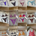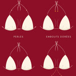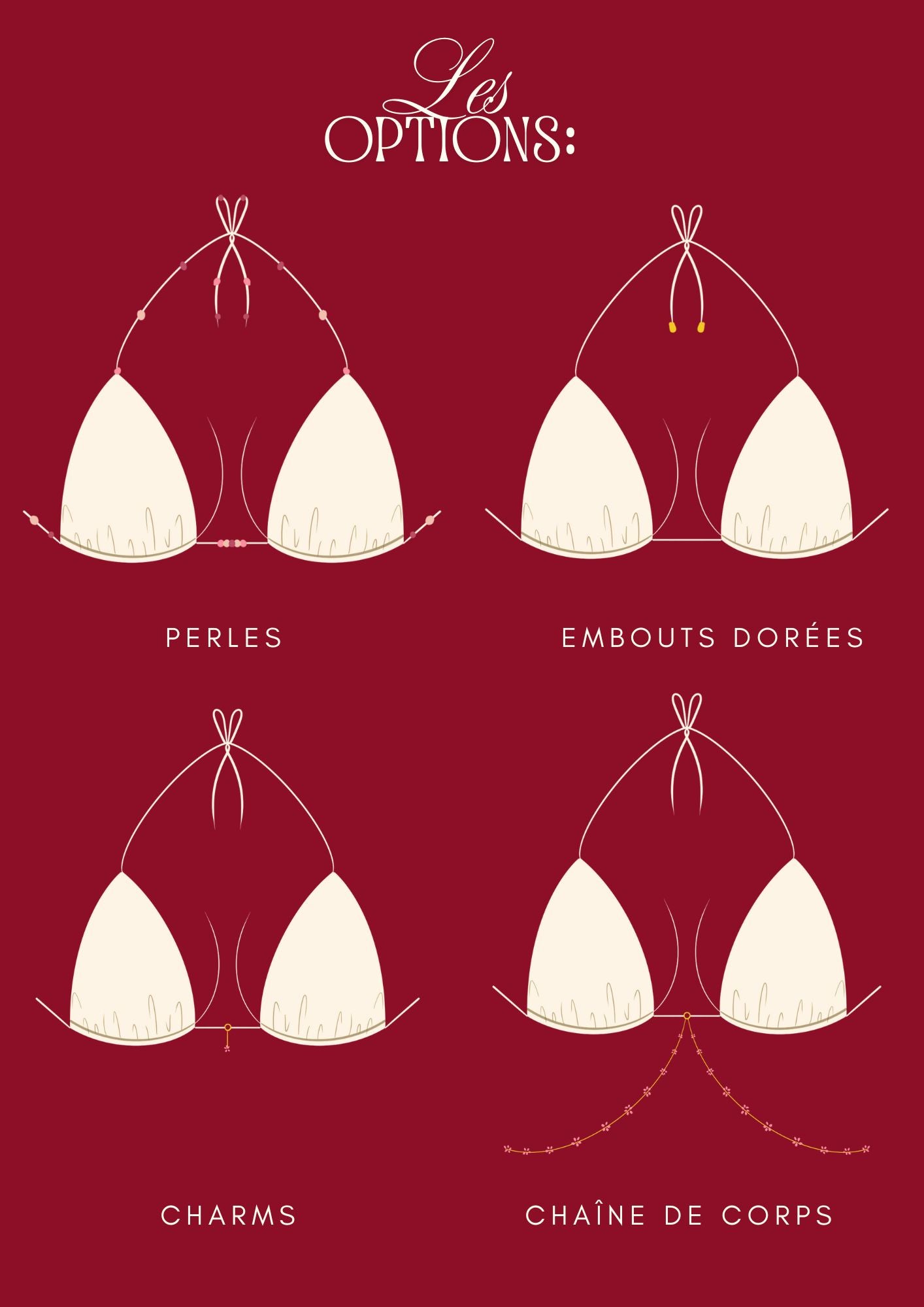 Désormais, vous pouvez personnaliser votre bikini avec de délicats charms créés et assemblés à la main à Paris, ainsi que des perles et finitions dorées minutieusement ajoutées pour sublimer chaque détail. Ces touches précieuses rendent chaque modèle encore plus singulier, transformant votre bikini en véritable bijou textile.