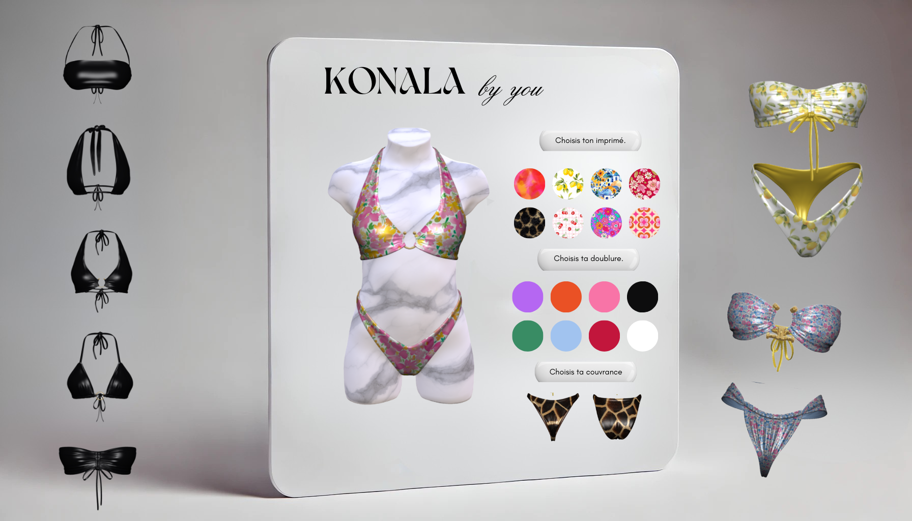 Bienvenue dans Konala By You, l’espace 3D révolutionnaire qui te permet de créer un maillot de bain entièrement sur-mesure, à ton image. Ici, chaque détail compte, et c’est toi qui choisis tout :
